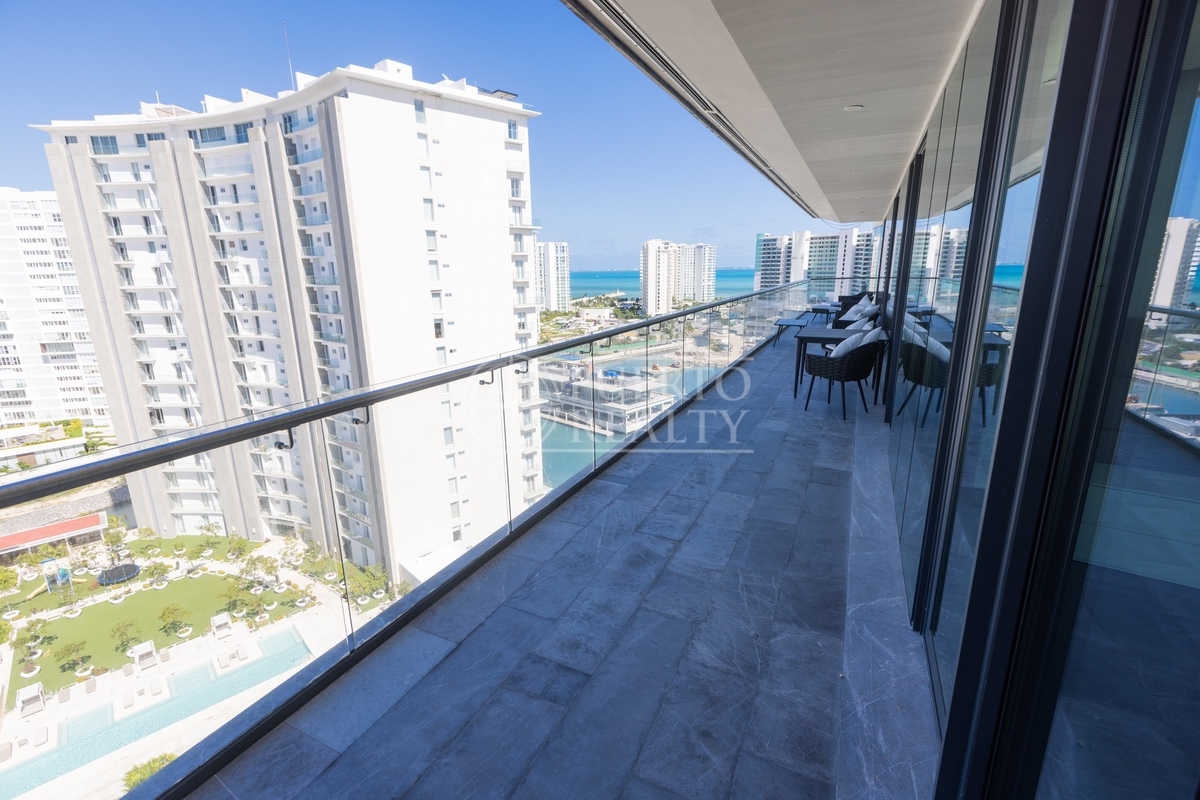 Cada una de las tres amplias recámaras cuenta con baño completo y walk-in closet, diseñadas para ofrecer la máxima privacidad y confort. La recámara principal destaca por su generoso espacio y luminosidad. La distribución inteligente integra el área social con la cocina de concepto abierto y su gran barra, manteniendo las recámaras en un entorno privado y tranquilo, lejos del bullicio. El acceso a la terraza perimetral brinda una de las mejores vistas en todo Puerto Cancún, creando el marco perfecto para el entretenimiento o la relajación.